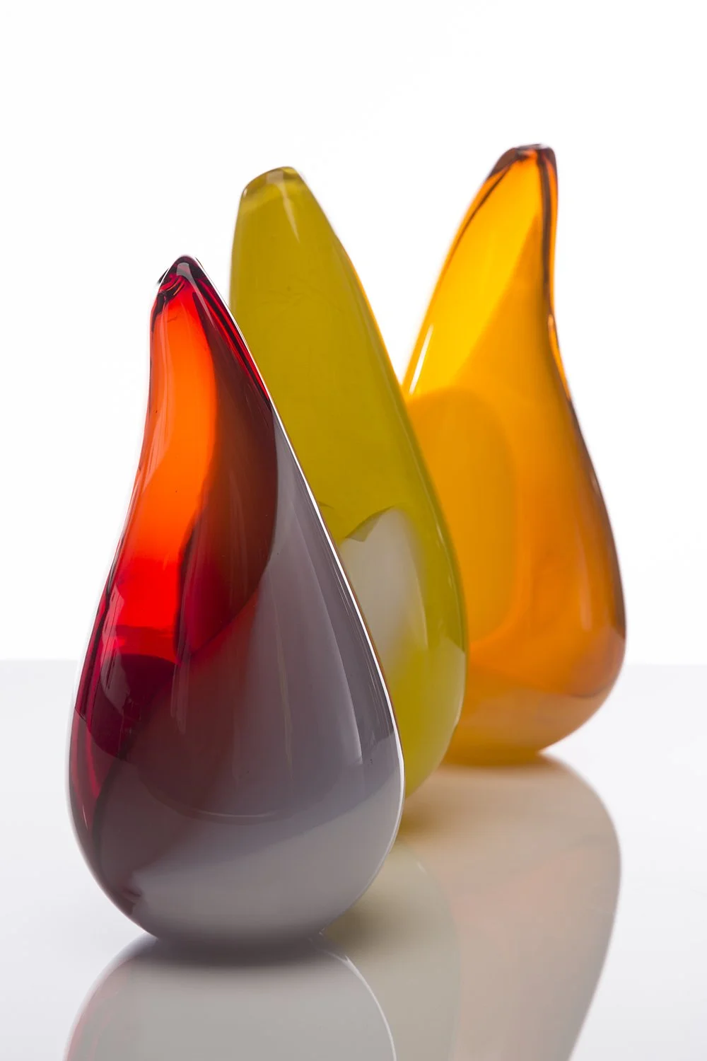 Her glass pieces are made using traditional glass blowing techniques, gathering the molten glass and adding colour then manipulating it with tools to create the desired form, whilst letting the colours speak for themselves and creating their own unique movement in the glass.