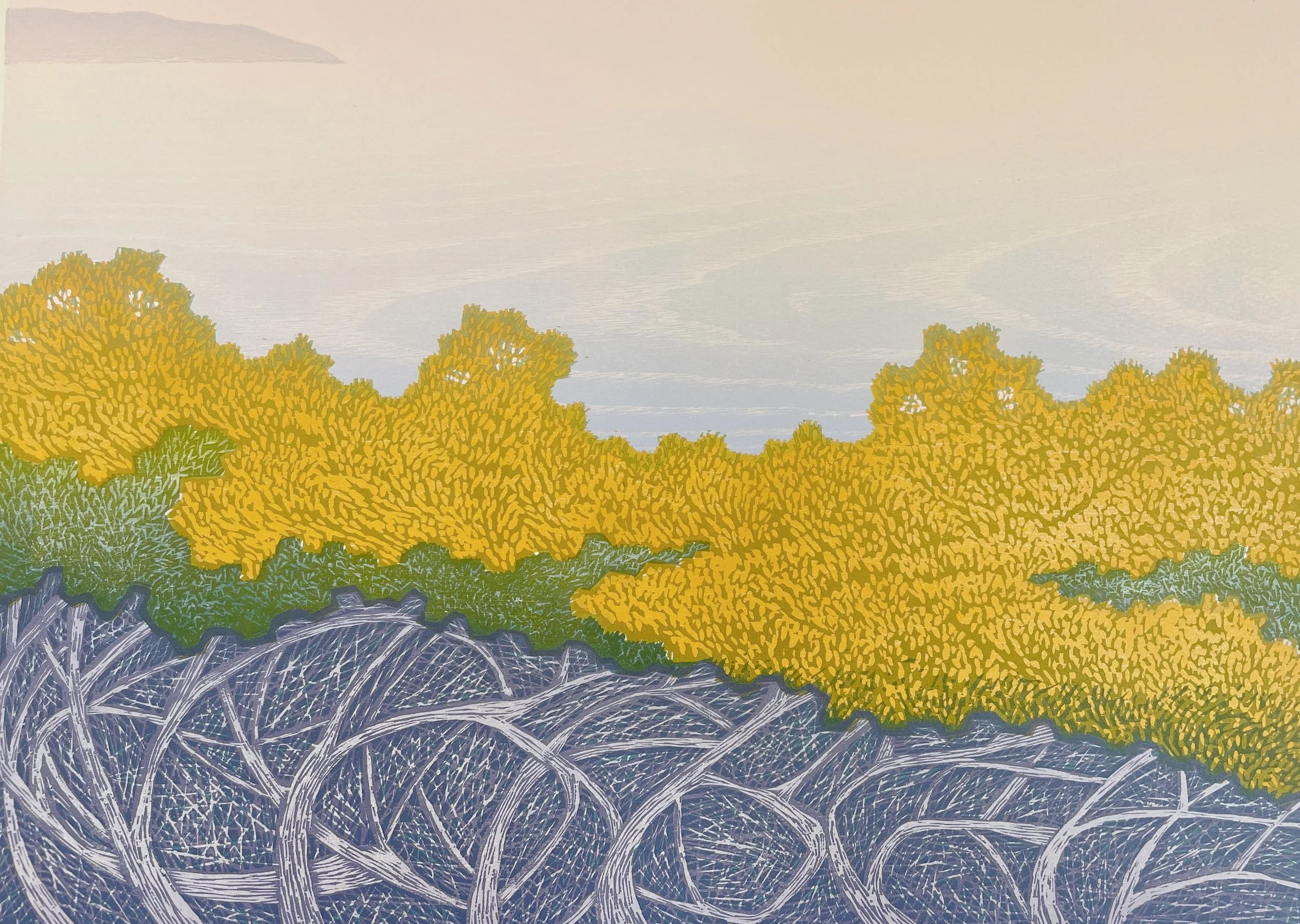 She works primarily with relief printing methods, and the printmaking process itself greatly influences her work, as each stage brings its own exciting opportunities. She works intuitively on the block to add texture and pattern using the natural marks made by the tools, often using the printed woodgrain to form key elements of her design.