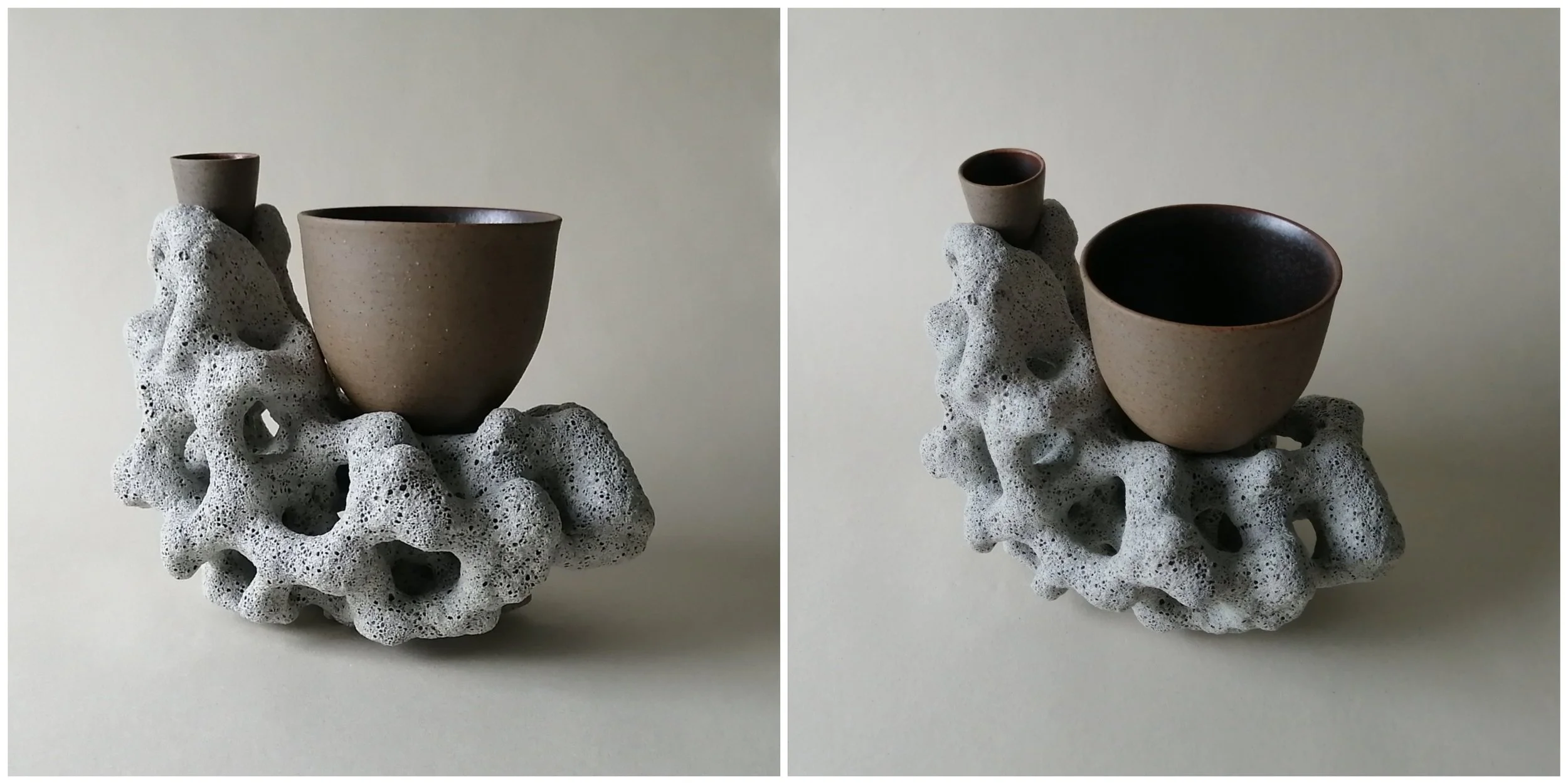 Currently, I have been working on ideas involving throwing vessels on the potters wheel and combining them with sculptural bases to create pieces that are functional as well as decorative. The contrasting textures play a large role in my work, heavily textured bases and smooth finished vessels allows for interesting tactile areas.