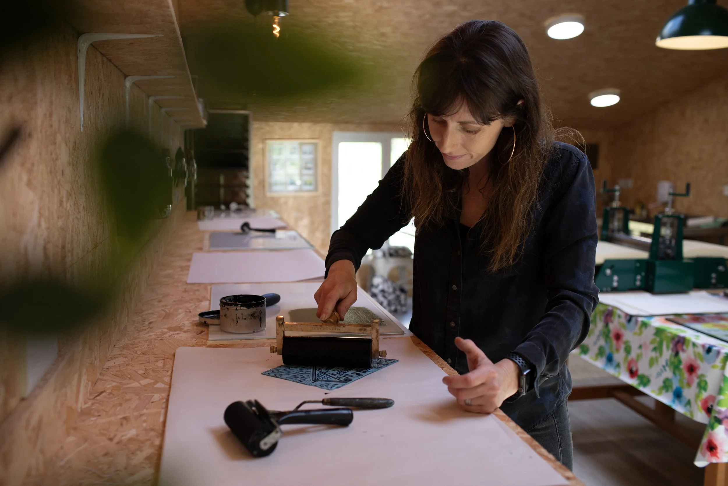 Elin is an artist from Machynlleth who creates print work taking inspiration from the landscape around her in her home in Mid Wales. The way of life of her Welsh countryside community has a great influence on her, especially the contrasts and changes that happen daily. The focus of the work derives from a concept of belonging to a community, a sense of place, language, and country. As she researched, Elin realized that feelings of security and comfort were at the root of her findings, and an appreciation of the privilege of feeling safe in a world full of war and injustice. The agricultural shed in which she spent so much time when she was younger became a symbol of warmth and shade.