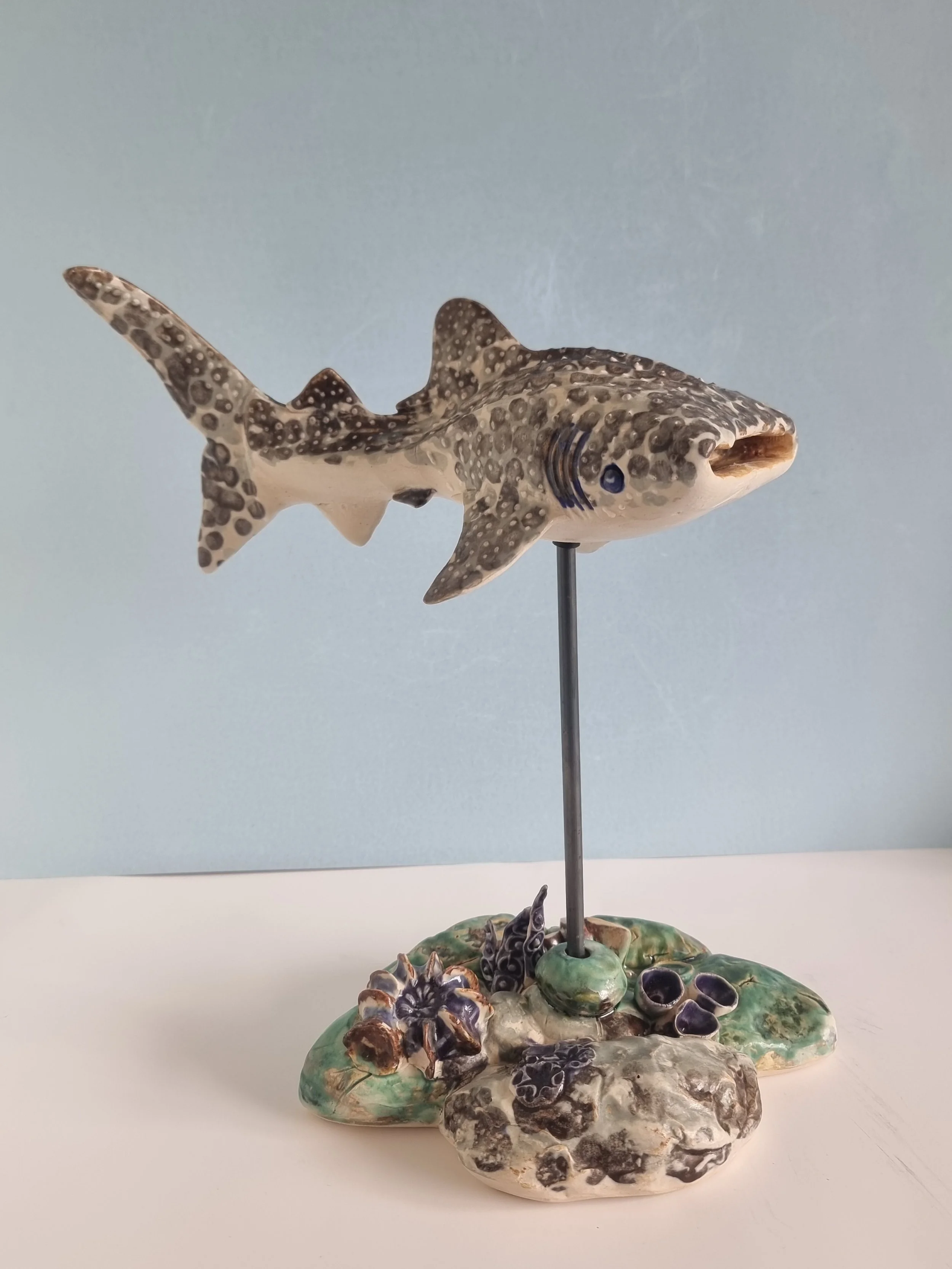 The sharks are made from a thrown vase form. The features are purposely exaggerated to make people smile.
