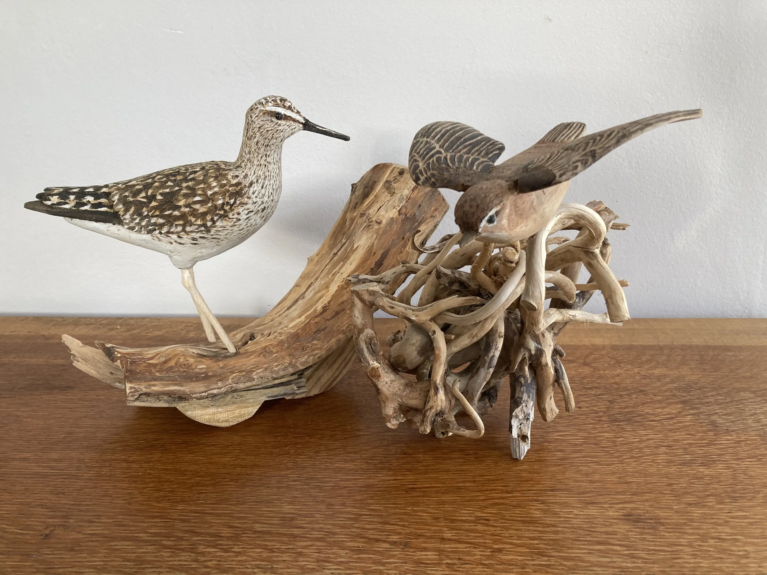 John and Marilyn Davies carve and paint wooden birds in their workshop in Prestatyn. The interest began in America in the 1970s where the decoy tradition is well established. John began woodcarving in 1977 after a year in Michigan. During further year-long visits to Washington State and Utah they came into contact with carvers and began their own practice. John uses mainly hand tools to carve the birds, enjoying their shape in the hand. Marilyn employs a pyrography tool to burn the feather barbs and paints using thin acrylic washes which allow the texture to emerge. Driftwood bases are an essential component and John spends many hours combing the banks of the Clwyd and Conwy rivers to find the ideal pieces.
